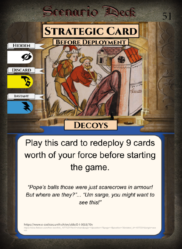 In order to do this you use decks to choose your officers, troops, equipment, level of morale, special training, advantages like ambushing etc. or to lay traps or effects on your enemy