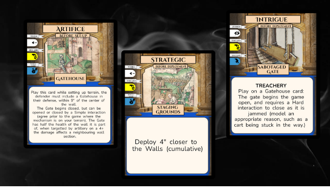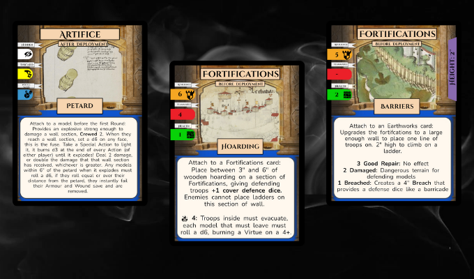 Alongside the Siege Campaign is the Siege Deck. Much like regular Force of Virtue, we opted to organise the preparations, tactics, and capabilities available to you via cards that you can pick to bring them to the battlefield. The level of walls can be adjusted to the terrain available in your collection, or you can create your own defensive line based on what you pick. Even when playing one-off games, it is easy to create scenarios straight out of history!