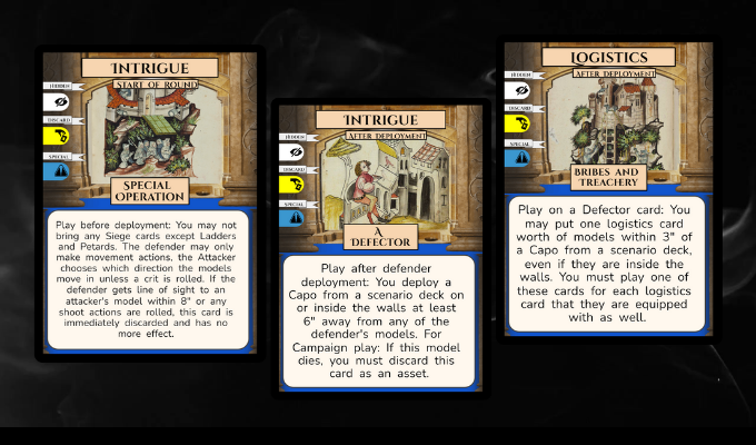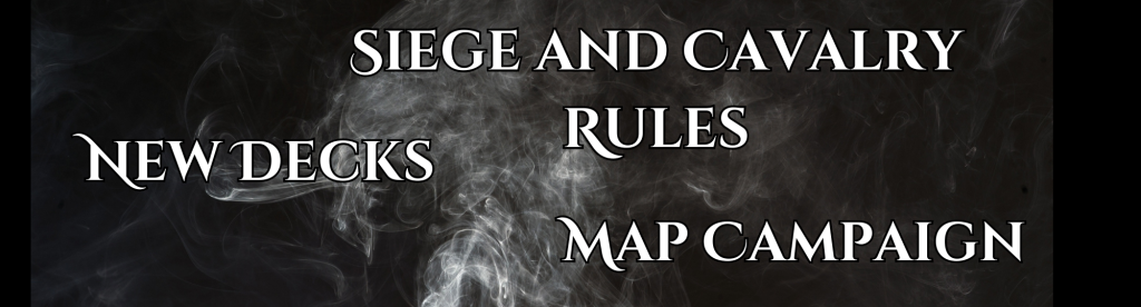 Mechanically, this led us to opt for three resources to track: Supplies, Troops, and Support. These are tracked over Theatres, for example in the Gradara Siege Scenario that comes with the new rulebook, there are three: Town, Siege Camp, and Hinterlands. Should any resource reach 0 in a Theatre, then there are consequences! As resources are hidden, you don’t quite know how close your opponent is to capitulation, at least not until their Supply runs out and Troops begin to desert enmasse!
