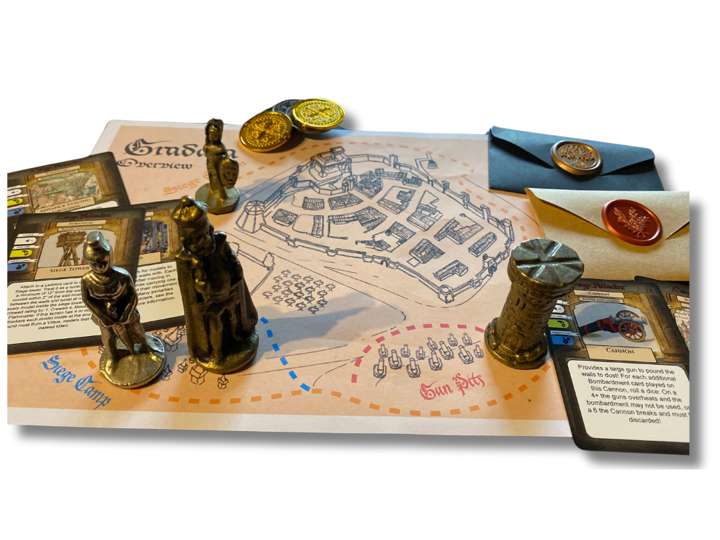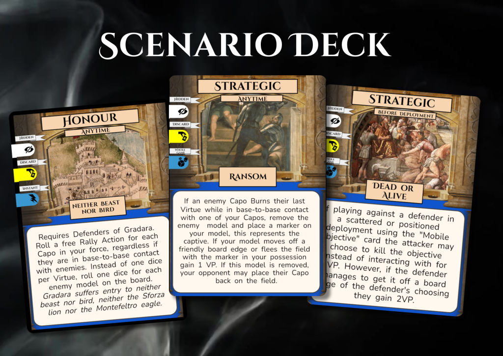 We have created a scenario deck to go along with the siege deck to add-in a few elements that stand out in Gradara’s long history of sieges, intrigues and violence! Hidden tunnels that connect to Etruscan tomb systems, mobs of frightened or violent civilians, civilians helping to reload guns and crossbows (remember the family that kills Montefeltri together, stays together) and more!