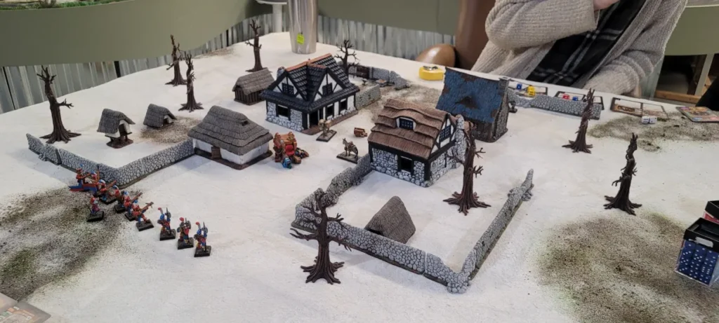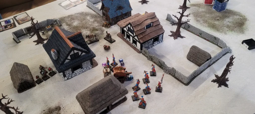 • Donkeys have 2 virtue, 2 faith, and 1 action. After both players have passed but before the turn ends the donkeys do a 2 virtue movement. We used speed as the donkeys are frightened, but mixing the speed crit fail and the audacity crit success would probably have worked better. They will move directly away from models within 4″ or will otherwise move in a random direction. If a donkey has burnt its last virtue it will collapse and will spend a single action trying to rally.